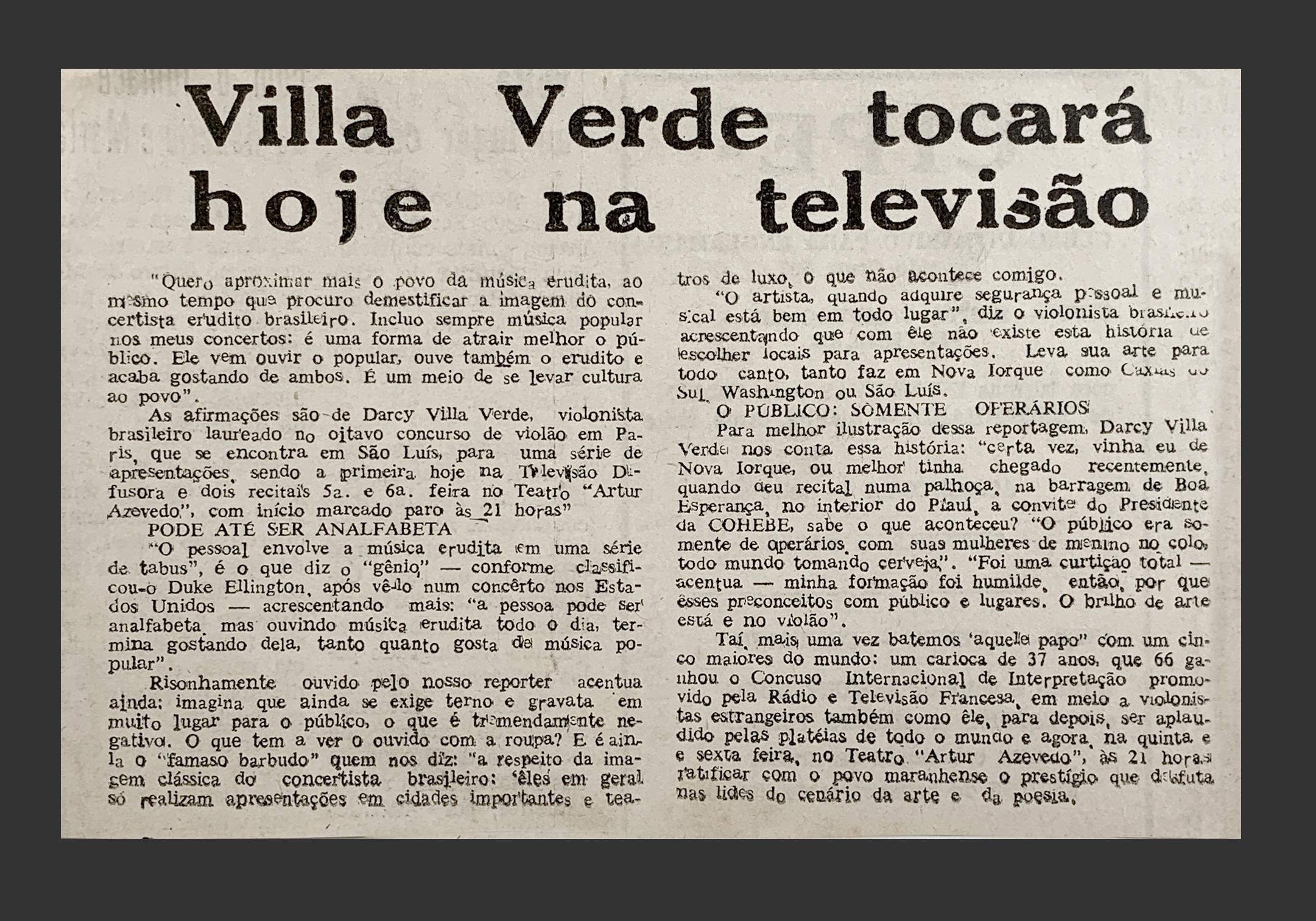 “…realmente, o senhor Darcy Villa Verde cumpriu com a palavra e fomos todos convidados à reunião que se deu em belíssima casa, cheia de personalidades do mundo da música e da arte, na qual o violonista em questão, apesar de toda a dificuldade narrada por ele, se apresentou por ‘mais de uma hora’.