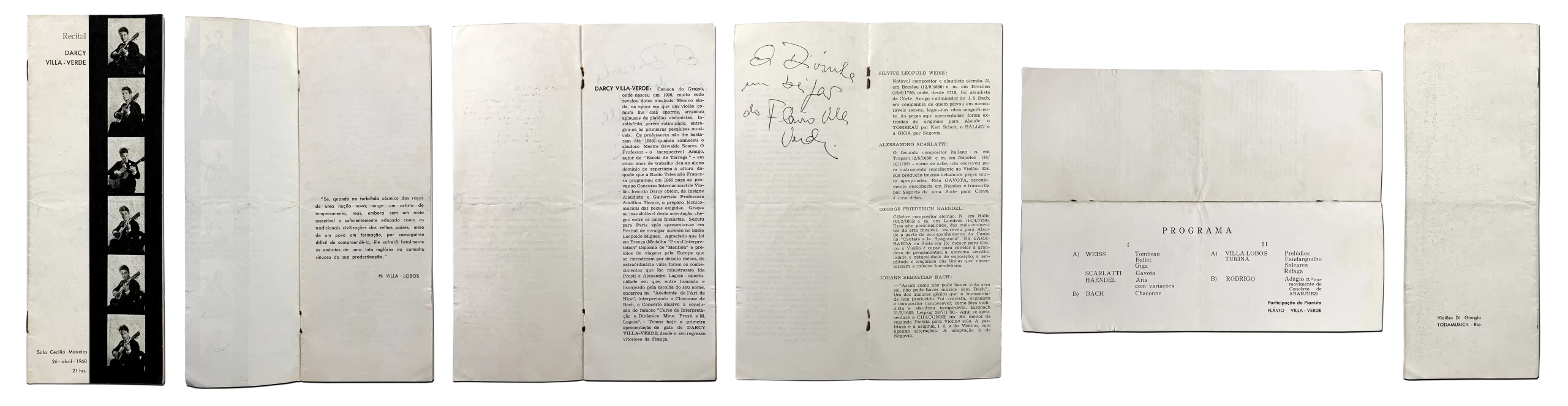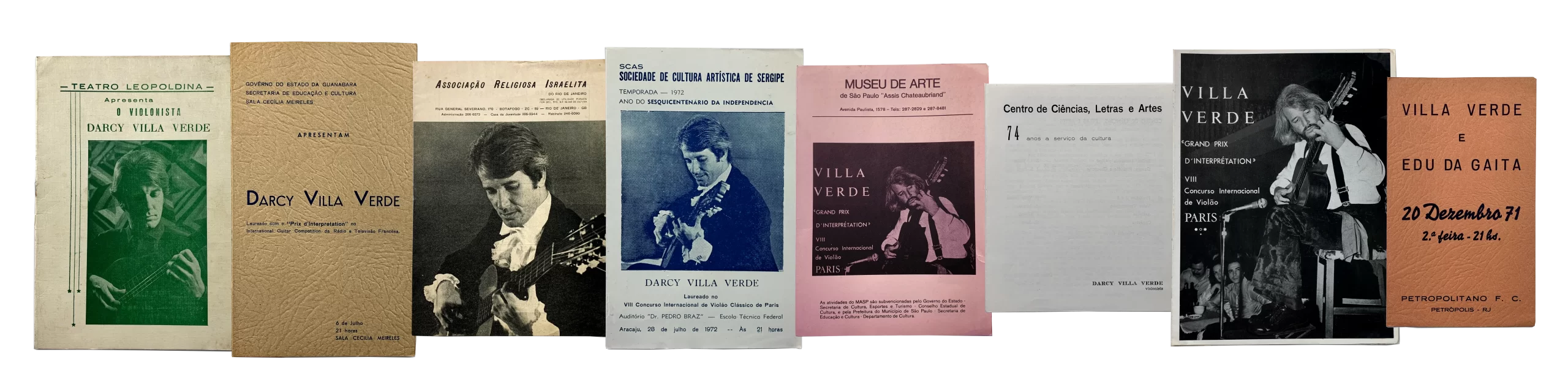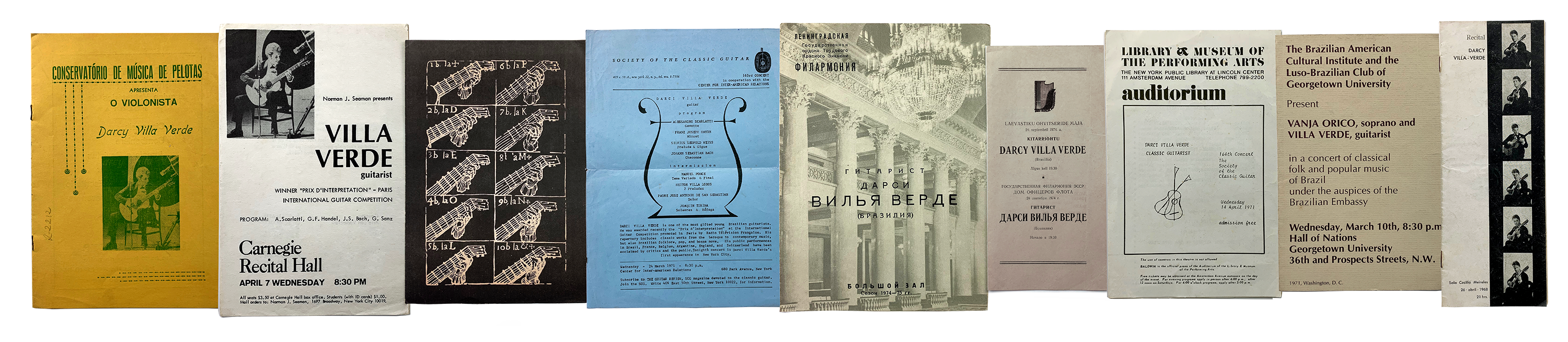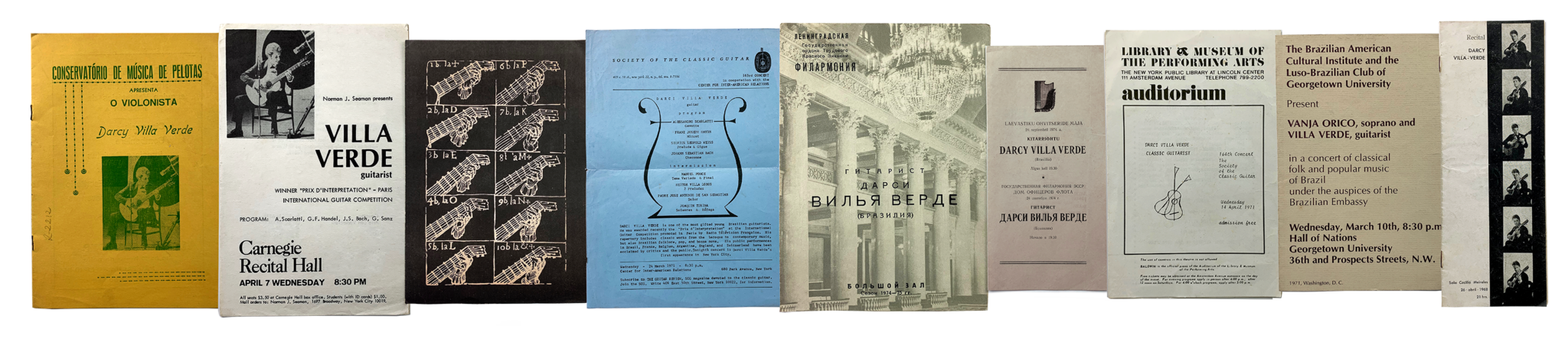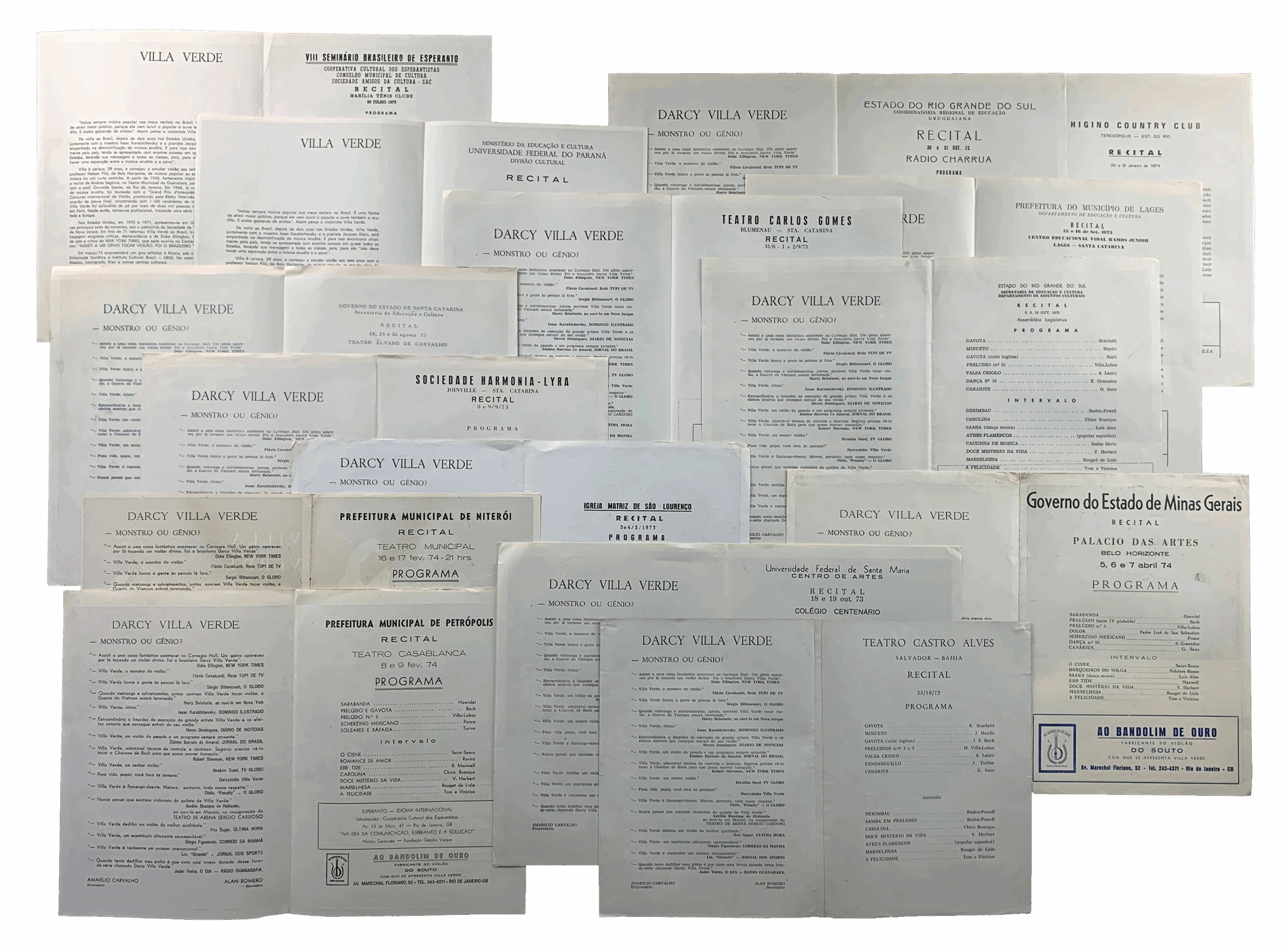 Raríssimos exemplares de programas dos recitais e concertos de Darcy Villa Verde dados no Exterior e no Brasil.