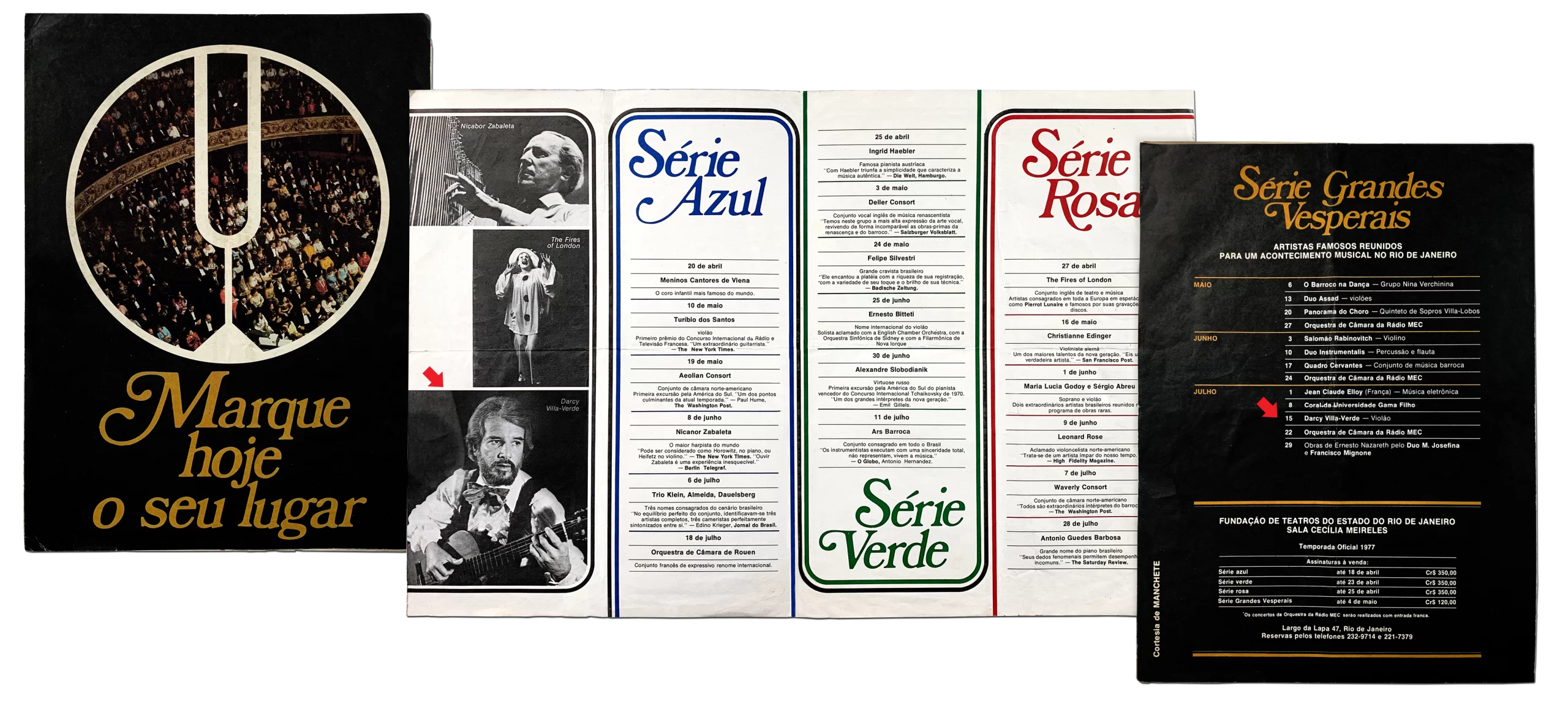 Abaixo, a oportunidade de olhar de perto alguns dos programa dos recitais e concertos de Darcy Villa Verde, observando maiores detalhes como gênero, estilo de música e alguns textos da época. Mais abaixo, alguns folders sobre Darcy Villa Verde e suas apresentações na Sala Cecília Meireles. Anos 70. [Coleção particular]