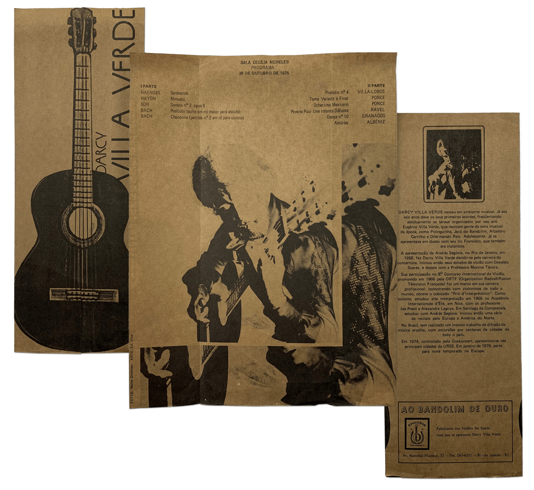 Programa de recital na Sala Cecília Meireles, outubro de 1975. Clássico exemplo de como montava programa. Recital dado logo após o retorno de Darcy Villa Verde de uma longa tournée na URSS e sua partida para a Europa. Coleção particular.